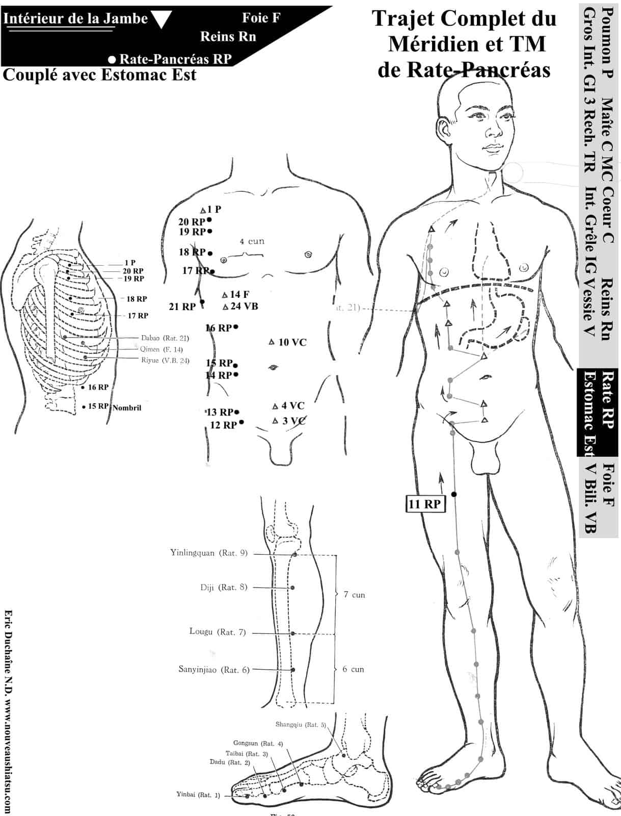 La Rate-Pancréas gouverne la transformation des aliments et le transport des substances nutritives (Pi Zhu Yun Hua), les muscles, les membres et le Sang. Elle maintient les Organes vers le haut, s’ouvre à la bouche et se manifeste aux lèvres. Son principal rôle est un rôle sélectif d’extraction des essences « subtiles » des aliments et des boissons reçus par l’Estomac et de les transporter vers tous les tissus du corps pour les nourrir. Elle assure la montée du « pur » qui servira à la production du Qi (Pi Zhu Sheng Qing) vers le Poumon.